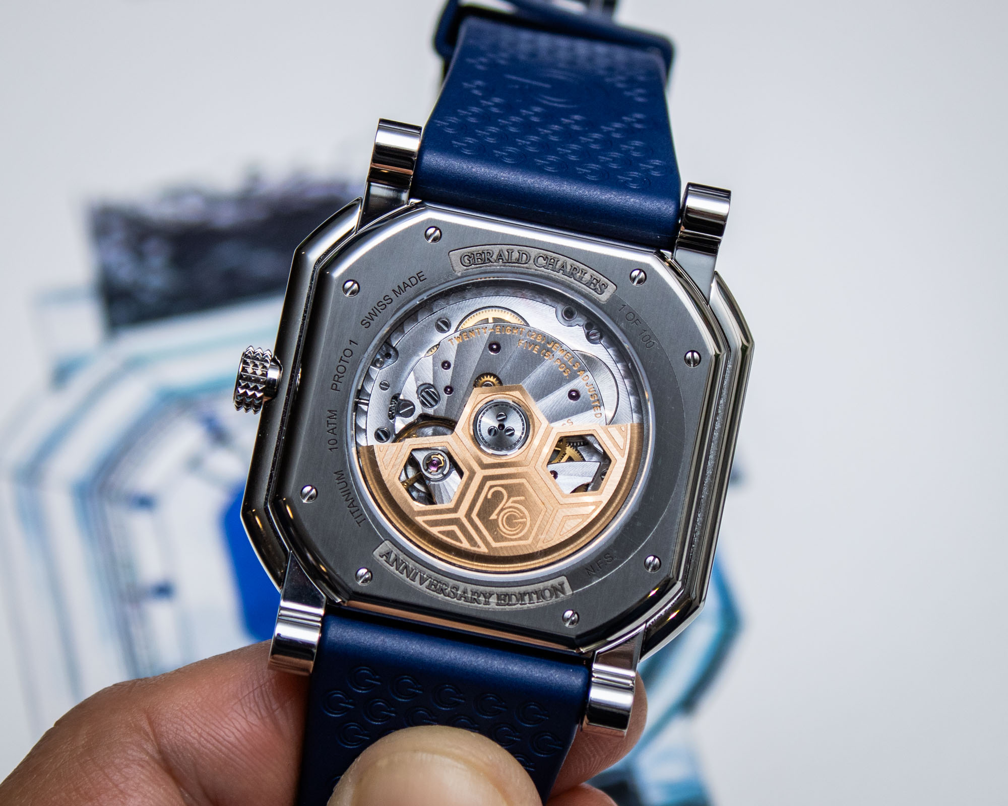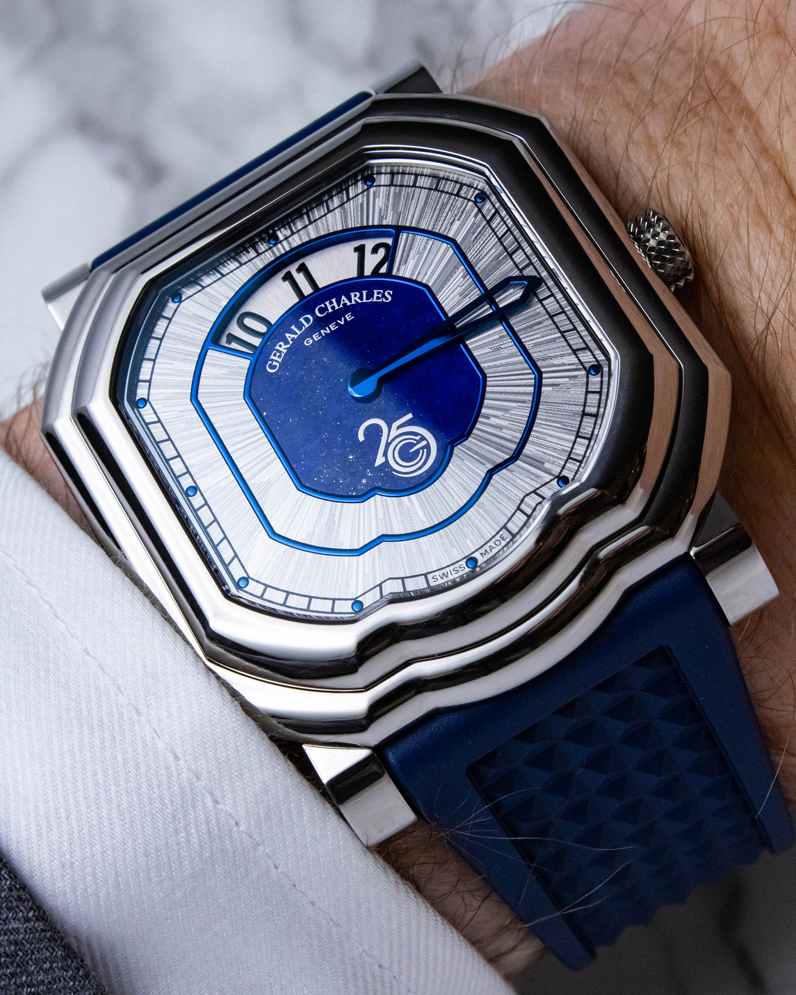 Just as you would expect from Gerald Charles, the finishing on its Manufacture 4.0 Caliber jumping hours movement is executed to very high standards, with rhodium-plated gears set among matching bridges that are adorned by perlage and Geneva stripes. Additionally, the movement is fitted with a gold-finished rotor that is decorated with the brand’s honeycomb motif, and it is engraved with the same 25th anniversary logo that appears on the dial. Including the additional height of its signature jumping hours module, the the Manufacture 4.0 Caliber comes in at a total of 6.15mm thick, and since the module is fitted to the dial-side of the movement, the view through the display window in the caseback reveals a self-winding movement that looks almost identical to what can be found inside the Maestro 2.0 Ultra-Thin Lapis Lazuli that was released at the beginning of this year as part of the brand’s ongoing 25th anniversary celebrations.